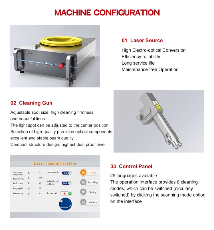 Као бесконтактна машина за ласерско чишћење, не оштећује подлогу делова, нема уштеду енергије и заштиту животне средине, и може ефикасно уклонити смолу, уље, мрље, прљавштину/рђу, премазе, облоге и боју са површине радног комада како би испунио захтеве за чишћење на сложено моделирање и фино позиционирање у пољу индустријске обраде, постигао већи, нижи степен чистоће и нижи степен ефикасности производње и ефекат чишћења.