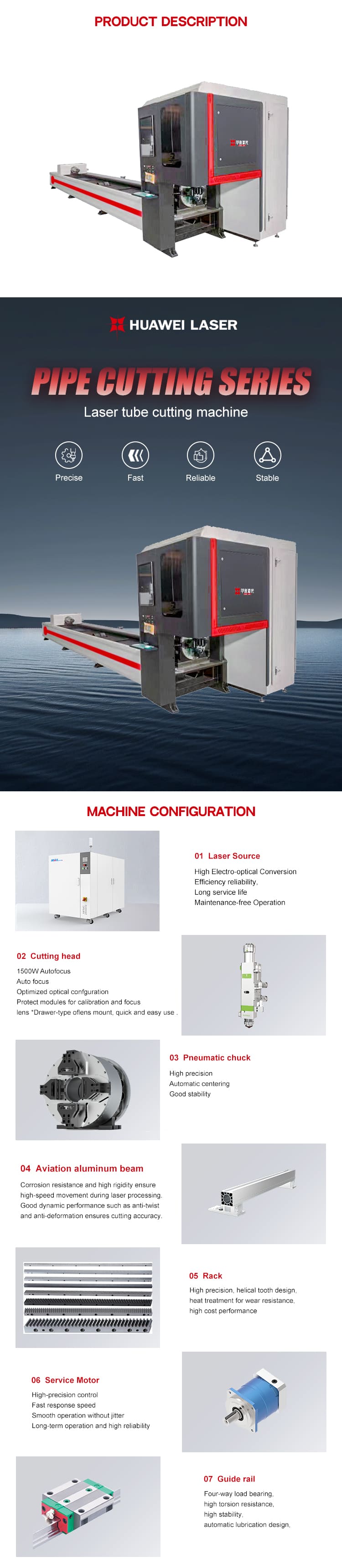 ХУАВЕИ ЛАСЕР 6000В Високо прецизна машина за ласерско сечење цеви са двоструком главом дизајнирана је за ефикасну и прецизну обраду округлих, квадратних и неправилних металних цеви. Његов систем са двоструком стезном главом обезбеђује стабилно стезање, минималне вибрације и прецизну ротацију током сечења великом брзином. Опремљен извором ласерског влакна високих перформанси и софтвером за интелигентну контролу, пружа чисте резове, глатке ивице и одличну поновљивост. ХУАВЕИ ЛАСЕР Доубле-Цхуцкс Тубе Фибер Ласер Цуттинг Мацхине је напредна ручна алтернатива за ласерско заваривање дизајнирана посебно за високоефикасну обраду цеви и цеви. Опремљен са двоструким пнеуматским стезаљкама, обезбеђује стабилно стезање, аутоматско центрирање и прецизну ротацију за глатке, прецизне резове на округлим, квадратним и неправилним металним цевима. Његов извор ласерског влакна велике снаге пружа велику брзину сечења, чисте ивице и минималну термичку деформацију. Дизајниран за производњу метала, производњу намештаја, производњу опреме за фитнес и аутомобилске компоненте, ХУАВЕИ ЛАСЕР систем за сечење цеви пружа изванредну тачност, поузданост и продуктивност за савремене индустријске примене. Ова машина подржава аутоматско учитавање, оптимизоване путање сечења и брзо мењање материјала, што је чини идеалном за производњу намештаја, опреме за фитнес, грађевинских цеви и израде метала по мери. Пружа снажну поузданост и доследну продуктивност за апликације за обраду цеви.