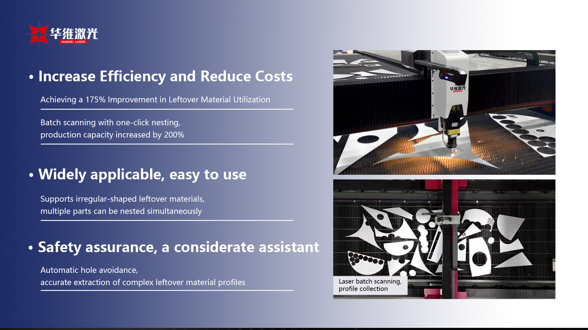 Интелигентни ретуристички систем Хуавеи Ласера може да обрађује неправилно обликоване остатке, руковање сложеним контурама и вршећи прецизно гнездење. Без обзира да ли се бави кружним, правоугаоним или разним неправилним облицима отпада, систем може интелигентно препознати и оптимизирати план гнежђења да би се осигурала ефикасна употреба сваког материјала. Поред тога, систем подржава вишедемне гнездење, побољшање ефикасности производње уз одржавање прецизности сечења и смањење времена обраде.